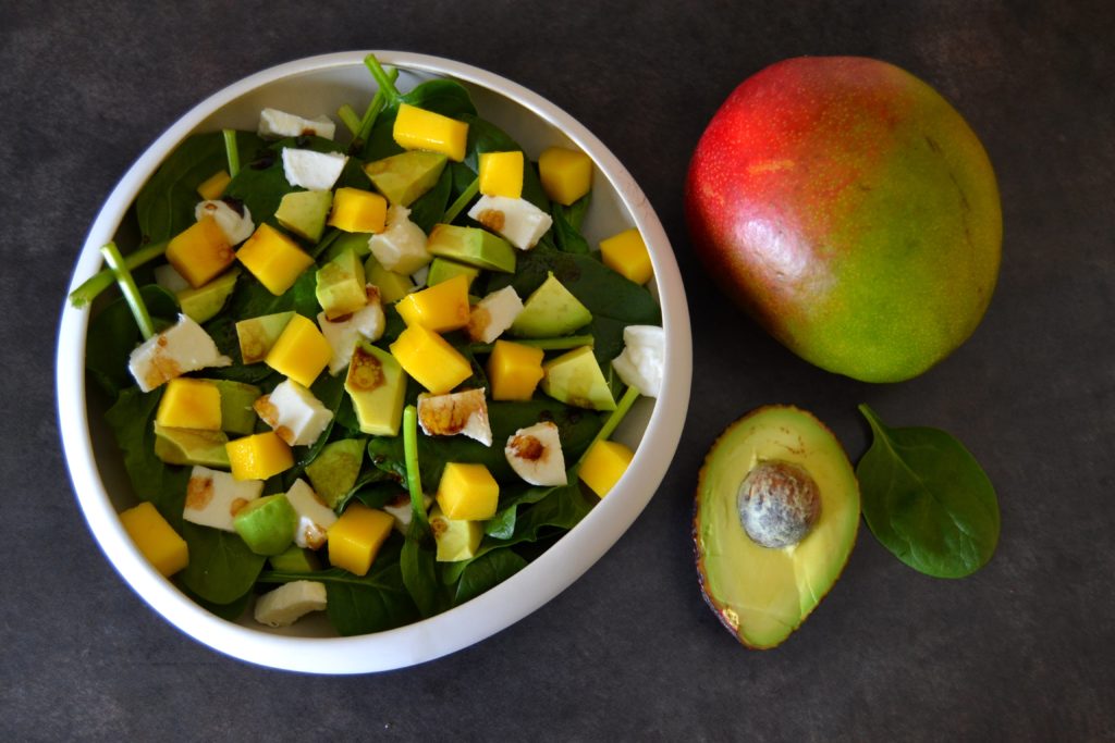 Rincer les pousses d’épinards à l’eau froide. Couper la mozzarella, la mangue et l’avocat en petits cubes et les ajouter aux feuilles d’épinards.