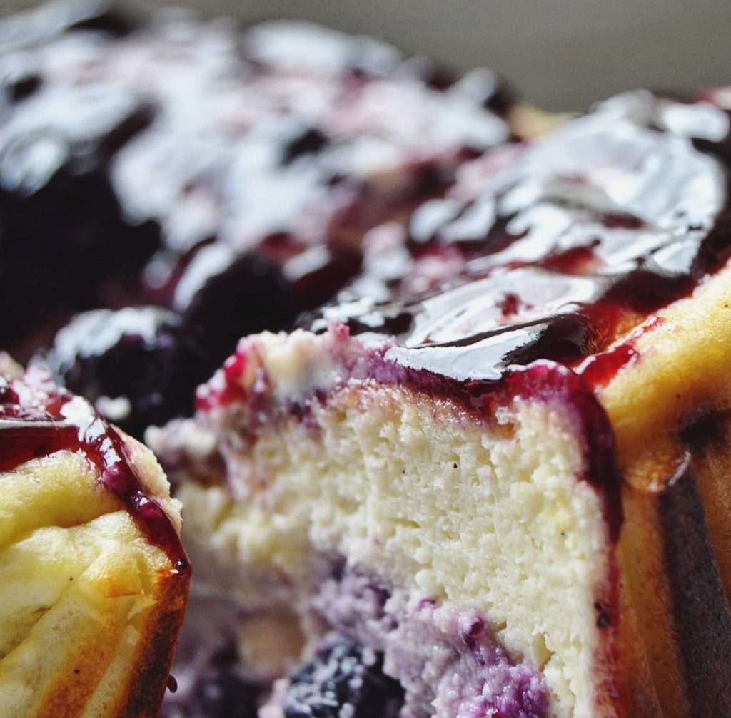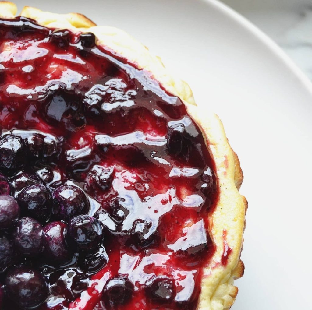 Fake cheesecake ; parce qu’il est beaucoup, beaucoup plus léger et bien plus intéressant en terme de macros qu’un cheesecake classique, par contre il n’en est pas moins gourmand. Réalisé dans un petit moule, on obtient là un gâteau bien haut qui rappelle visuellement le cheesecake japonais. Quand à la texture, on est à mi-chemin entre la mousse et le gâteau ; bien humide et frais, les myrtilles amènent beaucoup de douceur pour un goûter régressif à souhait.